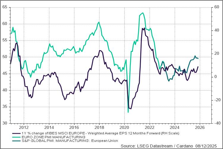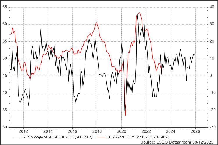 In Europa zien we een zelfde soort beeld. De PMI van de eurozone geeft aan dat het met de euro-economie een klein beetje beter gaat dan we een tijdje geleden dachten. Maar hosanna is het nog niet. De MSCI Europe daarentegen is 20% hoger dan een jaar geleden.
