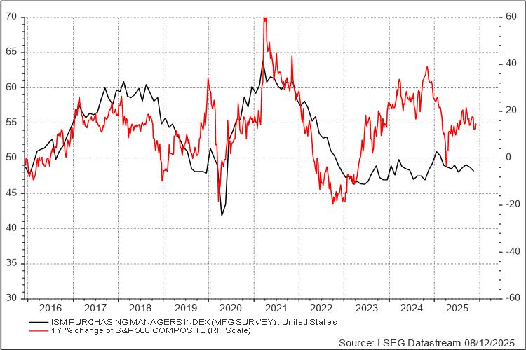 Het is nuttig om te kijken in hoeverre de beurzen al op een eventueel economisch herstel zijn vooruit gelopen. U ziet in de grafiek hieronder dat de beweging van de S&P 500 en de ISM index redelijk in lijn met elkaar lopen.